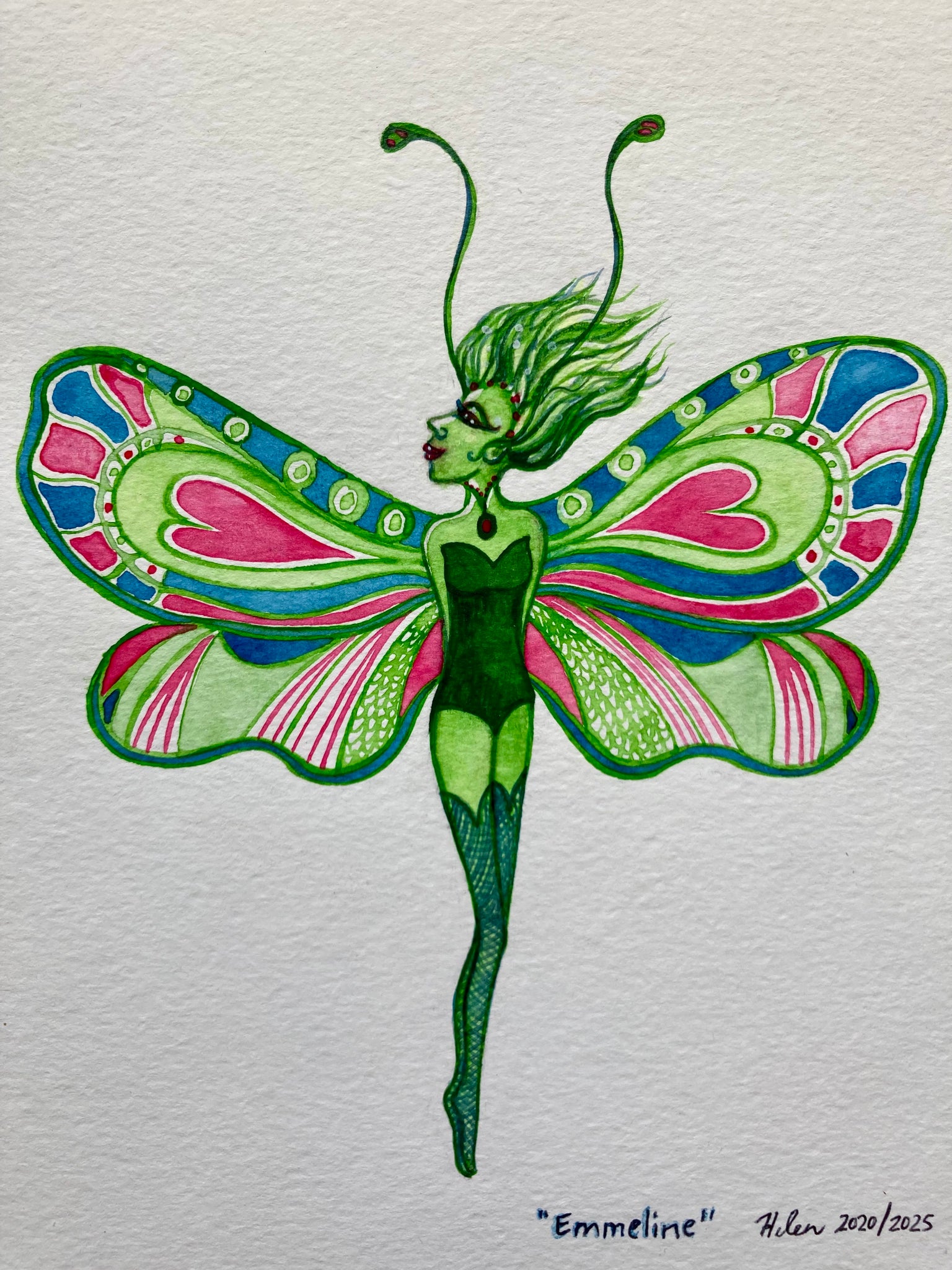 Graceful and weightless, with her flowing green hair and heart-themed wings, Emmeline is a butterfly spirit brought to life in luminous greens, pinks and blues.