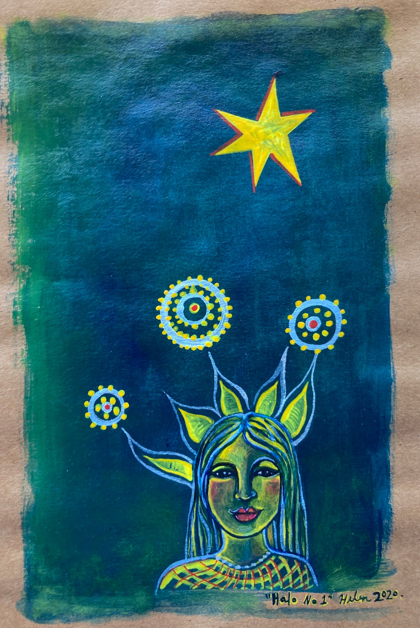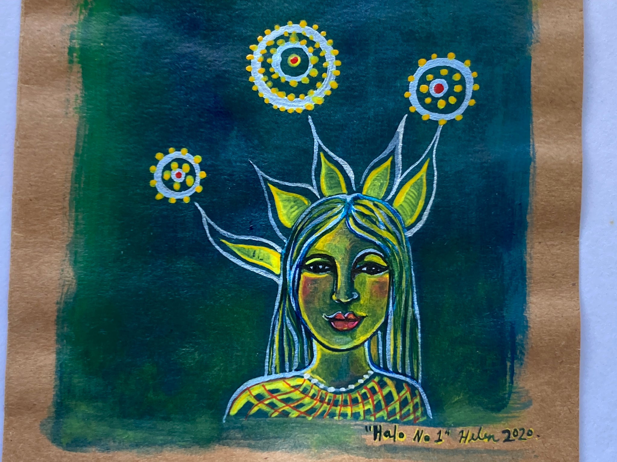When I began experimenting with painting 'halos', I started numbering them, as I knew there would be more than one.  Halos and auras had been appearing through my scribbles for years.  This one from 2020 begins the journey of painting them as a small series.  Acrylic on kraft paper, 148 X 210mm, this painting comes unframed, allowing you to frame to your taste.