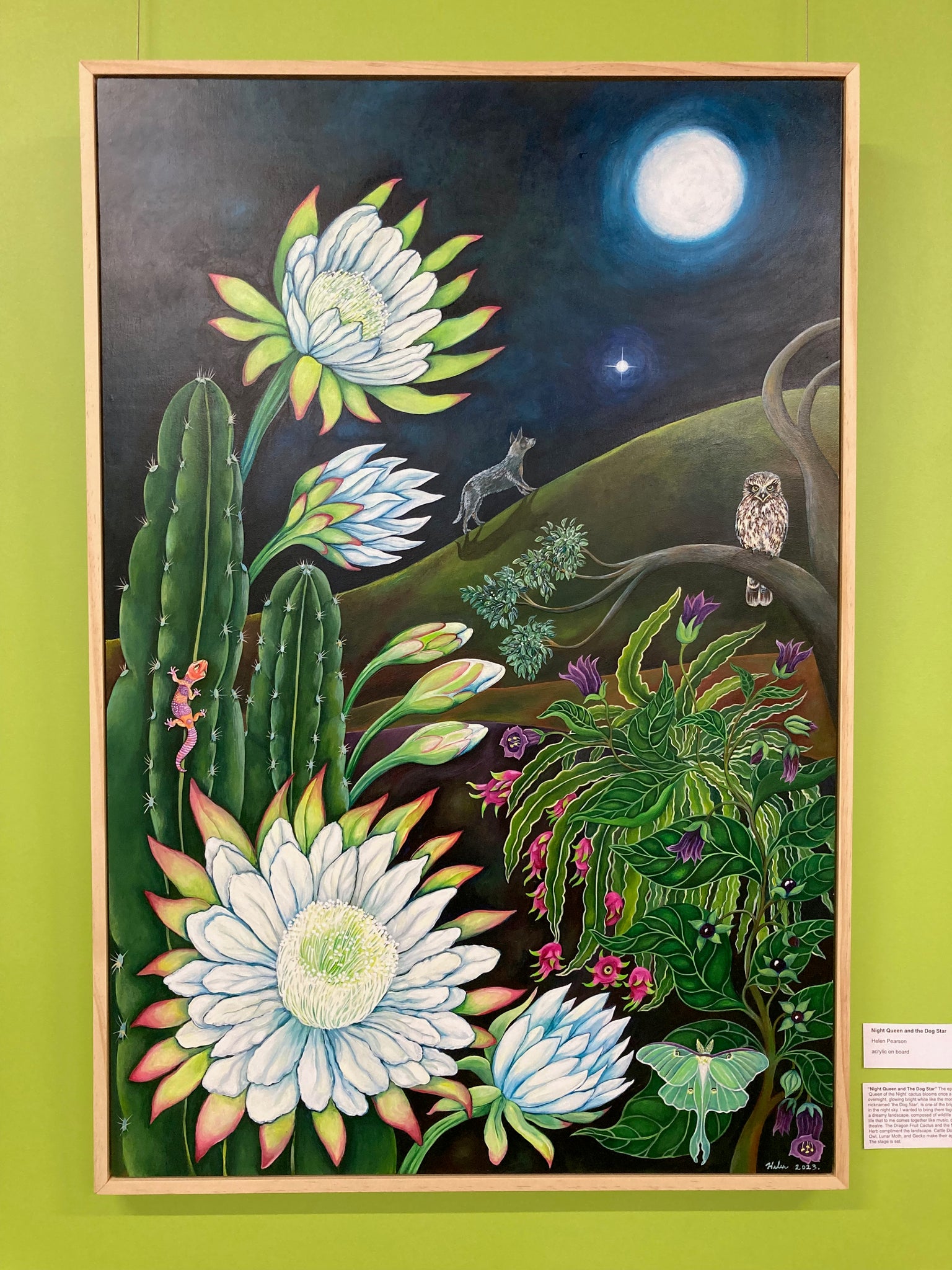 The ‘Queen of the Night’ cactus blooms once a year, overnight, glowing bright white like the moon.  Sirius, nicknamed ‘the Dog Star’, is one of the brightest stars in the night sky.  Both the ephemeral cactus flower and the Dog Star captured my imagination.  I wanted to bring them together within a dreamscape, composed of wildlife and plant-life that to me comes together like music, dance, theatre.  The Dragon Fruit Cactus and the Nightshade Herb compliment the landscape.  Cattle Dog, Boobook Owl, Lunar Moth, and Gecko make their appearance.  The stage is set.